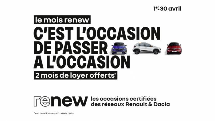 Du 1er au 30 avril, le Mois Renew vous permet de bénéficier de 2 mois de loyer offerts sur une sélection de voitures d’occasion Renault et Dacia. Cette opération nationale relayée par BodemerAuto, réseau de concessions leader du Grand Ouest, concerne plus de 500 véhicules d’occasion disponibles en Bretagne et en Normandie. Citadine, SUV, berline, utilitaire, essence, hybride, véhicule récent ou faible kilométrage : tous les profils d’automobilistes peuvent trouver l’occasion qui leur correspond.